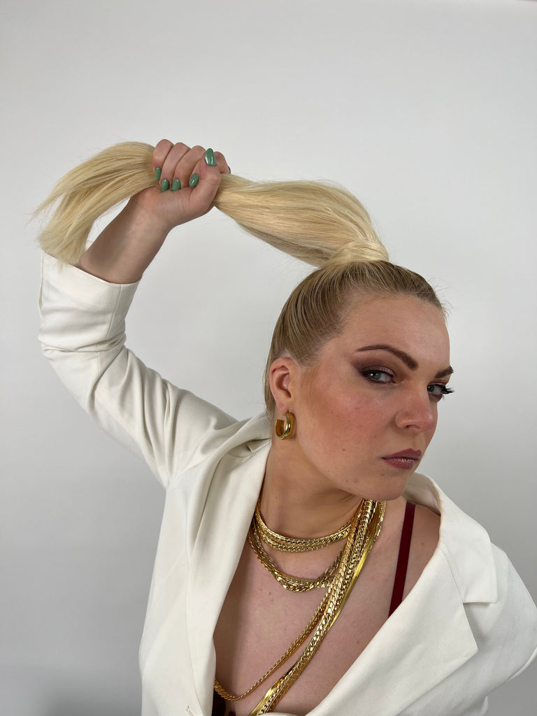 Få en smuk, lang og fyldig hestehale med vores Sleek Ponytail af ægte remy hair.